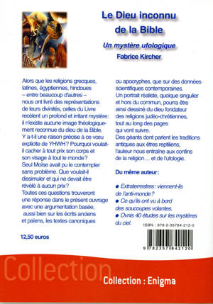 Alors que les religions grecques, latines, égyptiennes, hindoues – entre beaucoup d'autres – nous ont livré des représentations de leurs divinités, celles du Livre recèlent un profond et irritant mystère : il n'existe aucune image théologiquement reconnue du dieu de la Bible. Y a-t-il une raison précise à ce vœu explicite de YHWH ? Pourquoi voulait-il cacher à tout prix son corps et son visage à tout le monde ? Seul Moïse avait pu le contempler sans problème. Que voulait-il dissimuler et qui ne devait être révélé à aucun prix ? Toutes ces questions trouveront une réponse dans le présent ouvrage avec une argumentation basée, aussi bien sur les écrits anciens et païens, les textes canoniques ou apocryphes, que sur des données scientifiques contemporaines. Un portrait réaliste, quoique singulier et hors du commun, pourra être ainsi dessiné du dieu fondateur des religions judéo-chrétiennes, tout au long des pages qui vont suivre. Des géants dont parlent les traditions antiques aux êtres reptiliens, l’auteur nous entraîne aux confins de la religion… et de l’ufologie.
