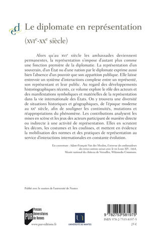 Alors qu'au XVIe siècle les ambassades deviennent permanentes, la représentation s'impose d'autant plus comme une fonction première de la diplomatie. La représentation d'un souverain, d'un État ou d'une nation par le diplomate exprime aussi bien l'absence d'un pouvoir que son apparition publique. Elle laisse entrevoir un système d'interactions complexe entre un représenté, son représentant et leur public. Au regard des développements historiographiques récents, ce volume explore le rôle des acteurs et des manifestations symboliques et matérielles de la représentation dans la vie internationale des États.