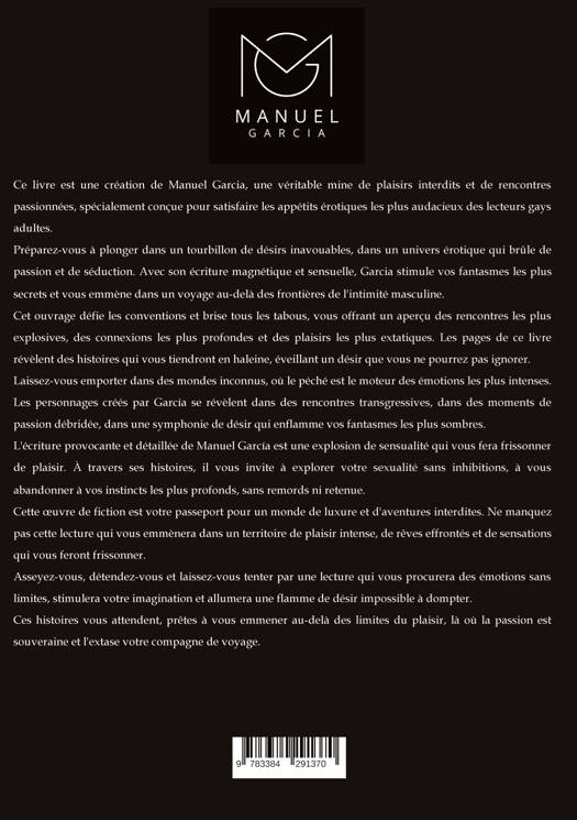 Ce livre est une création de Manuel Garcia, une véritable mine de plaisirs interdits et de rencontres passionnées, spécialement conçue pour satisfaire les appétits érotiques les plus audacieux des lecteurs gays adultes.Prépare-toi à te plonger dans un tourbillon de désirs inavouables, dans un univers érotique qui brûle de passion et de séduction. Avec son écriture magnétique et sensuelle, Garcia stimule tes fantasmes les plus secrets, t'emmenant dans un voyage au-delà des frontières de l'intimité masculine.Cet ouvrage défie les conventions et brise tous les tabous, t'offrant un aperçu des rencontres les plus explosives, des connexions les plus profondes et des plaisirs les plus extatiques. Les pages de ce livre révèlent des histoires qui te tiendront collé aux mots, éveillant un désir que tu ne pourras pas ignorer.Laisse-toi emporter dans des mondes inconnus, où le péché est le moteur des émotions les plus intenses. Les personnages créés par García se révèlent dans des rencontres transgressives, dans des moments de passion débridée, dans une symphonie de désir qui enflamme tes fantasmes les plus sombres.L'écriture provocante et détaillée de Manuel García est une explosion de sensualité qui te fera frissonner de plaisir. À travers ses histoires, il t'invite à explorer ta sexualité sans inhibitions, à t'abandonner à tes instincts les plus profonds, sans remords ni retenue.Cette oeuvre de fiction est ton passeport pour un monde de luxure et d'aventures interdites. Ne manque pas cette lecture qui t'emmènera dans un territoire de plaisir intense, de rêves effrontés et de sensations qui te feront frissonner.Assieds-toi, détends-toi et laisse-toi aller à une lecture qui te procurera des émotions sans limites, stimulera ton imagination et allumera une flamme de désir qui ne peut être apprivoisée.Ces histoires t'attendent, prêtes à t'emmener au-delà des limites du plaisir, là où la passion est souveraine et où l'extase est ton compagnon de voyage.