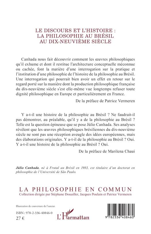 « Y a-t-il une histoire de la philosophie au Brésil ? Ne faudrait-il pas démontrer, au préalable, qu’il y a de la philosophie au Brésil ? Telle est la question épineuse que se pose Júlio Canhada. Ses analyses révèlent que les œuvres philosophiques brésiliennes du dix-neuvième siècle ne sont pas une réception aveugle des idées européennes, mais des élaborations originales. Y a-t-il de la philosophie au Brésil ? Oui. Y a-t-il une histoire de la philosophie au Brésil ? Oui. » De la préface de Marilena Chaui