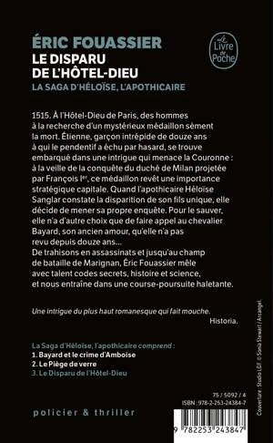 1515. À l’Hôtel-Dieu de Paris, des hommes à la recherche d’un mystérieux médaillon sèment la mort. Étienne, garçon intrépide de douze ans à qui le pendentif a échu par hasard, se trouve embarqué dans une intrigue qui menace la Couronne : à la veille de la conquête du duché de Milan projetée par François Ier, ce médaillon revête une importance stratégique capitale. Quand l’apothicaire Héloïse Sanglar constate la disparation de son fils unique, elle décide de mener sa propre enquête. Pour sauver la vie d’Étienne, elle n’a d’autre choix que de faire appel au chevalier Bayard, son ancien amour, qu’elle n’a pas revu depuis douze ans… De trahisons en assassinats et jusqu’au champ de bataille de Marignan, Éric Fouassier mêle avec talent codes secrets, histoire et science, et nous entraîne dans une course poursuite haletante.