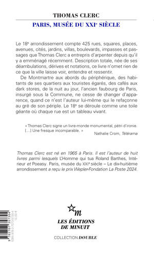 Le 18e arrondissement compte 425 rues, squares, places, avenues, cités, jardins, villas, boulevards, impasses et passages que Thomas Clerc a entrepris d’arpenter depuis qu’il y a emménagé récemment. Description totale, née de ses déambulations, dérives et notations, ce livre n’omet rien de ce que la ville laisse voir, entendre et ressentir.