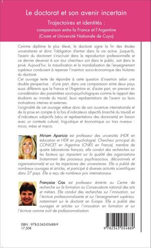 Aujourd'hui, la massification et la mondialisation de l'enseignement supérieur conduisent à repenser l'insertion socio-économique des titulaires du doctorat. Cet ouvrage tente de répondre à cette question d'insertion selon une double perspective : d'une part, dans une comparaison entre les deux pays aussi différents que la France et l'Argentine et, d'autre part, en prenant en considération des paramètres socio-psychologiques comme le rapport des étudiants au monde du travail, leurs représentations de l'avenir ou leurs motivations internes et externes.