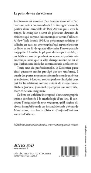 «Le Doorman» est le roman d'un homme secret vêtu d'un costume noir à boutons dorés. Un étranger devenu le portier d'un immeuble de Park Avenue puis, avec le temps, le complice discret de plusieurs dizaines de résidents qui comme lui sont un jour venus d'ailleurs. À New York depuis 1965, ce personnage poétique et solitaire est aussi un contemplatif qui arpente à travers ce livre et au fil de quatre décennies l'incomparable mégapole. Humble, la plupart du temps invisible, il est fidèle en amitié, prudent en amour et parfois mélancolique alors que la ville change autour de lui et que l'urbanisme érode les communautés de fraternité.