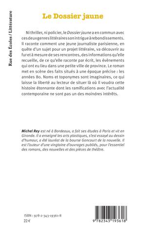Ni thriller, ni policier, Le dossier jaune n'en recèle pas moins une intrigue à rebondissements. Il raconte comment une jeune journaliste parisienne, en quête d'un sujet pour un projet littéraire, va découvrir au fur et à mesure de ses rencontres les évènements qui ont eu lieu dans une petite ville de province. Le roman met en scène des faits situés à une époque précise : les années 80 mais aussi ses liens avec l'actualité.