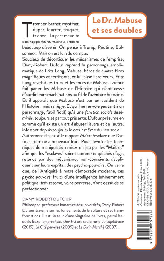 De l'Antiquité à notre démocratie moderne, les techniques de manipulation des masses n'ont cessé d'être et de se perfectionner. Dési reux d'explorer davantage la part maudite des rapports humains, Dany-Robert Dufour démonte, démontre et, plus encore, montre à l'oeuvre les ressorts de cette intelligence très retorse en utilisant le personnage emblématique de Mabuse, héros de quatre films magnifiques et terrifiants signés Fritz Lang, expert en déguisements divers, faux monnayeur, chef d'un gang de bandits, de voleurs et de trafiquants, etc. Fritz Lang révélait les trucs et les tours de Mabuse. Dufour fait parler les Mabuse qui ont fait l'Histoire... Et l'on comprend qu'un personnage aussi diabolique n'est jamais aussi à l'aise que lorsqu'il affecte de prendre ses assises du côté du Bien.
