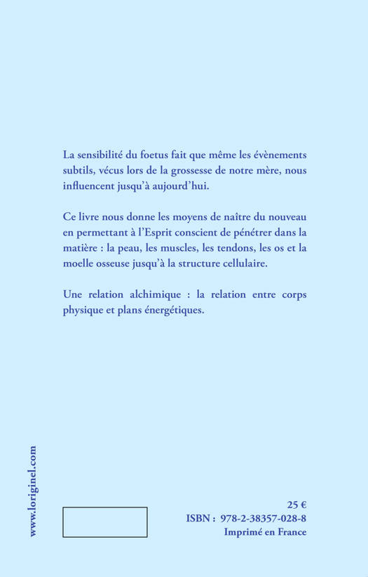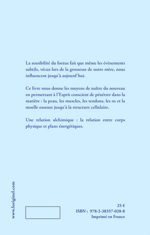 La sensibilité du f?tus fait que même les évènements subtils, vécus lors de la grossesse de notre mère, nous influencent jusqu?à aujourd?hui. Ce livre nous donne les moyens de naître du nouveau en permettant à l?Esprit conscient de pénétrer dans la matière : la peau, les muscles, les tendons, les os et la moelle osseuse jusqu?à la structure cellulaire. Une relation alchimique : la relation entre corps physique et plans énergétiques.