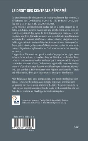Éclairer l'entrepreneur et le juriste sur les dispositions rénovées du Code civil, essentielles à la vie des affaires et donc au développement de l'entreprise, telle est l'ambition de cet ouvrage, rédigé par une équipe de praticiens chevronnés. Le droit français des obligations, spécialement celui des obligations contractuelles, a été réformé par l'ordonnance n°2016-131 du 10 février 2016, ratifiée par la loi n° 2018-287 du 20 avril 2018. Cette loi consacre des modifications substantielles - contrat d'adhésion et clause abusive, décès de l'offrant... D'autres modifications présentent un caractère interprétatif - préjudice réparable en cas de rupture fautive, abus de dépendance, dol... . Aujourd'hui, les contrats sont donc soumis à trois droits différents - droit pré-ordonnance, droit post-ordonnance, droit post-ratification. La table de concordance, tome 2 de l'ouvrage, facilité la comparaison entre les trois régimes juridiques.