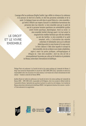 L’ouvrage offert au professeur Brigitte Feuillet-Liger reflète la richesse et la cohérence d’un parcours en droit de la famille, en droit des personnes vulnérables et de la santé. Ce triptyque trouve son unité dans le grand thème du «vivre ensemble» qui invite à réfléchir aux moyens d’assurer la cohabitation harmonieuse des personnes dans leur diversité. Le vivre ensemble saisi par le point de vue de la personne humaine questionne ses vulnérabilités qu’elles soient d’ordre psychique, physiologique, moral ou social. Le vivre ensemble familial interroge quant à lui tout autant la singularité des modèles familiaux que celle des individus au sein des familles. Le vivre ensemble et la santé renvoient, enfin, à l’articulation des volontés collectives et individuelles ainsi qu’à la délicate dialectique entre le corps humain et le corps social. Le livre s’adosse à l’idée selon laquelle le concept du vivre ensemble, loin de se réduire à une simple cohabitation, aspire à ouvrir les portes juridiques, anthropologiques et éthiques du «bien vivre ensemble» dont les clés ont été si remarquablement façonnées par celle qui fut fondatrice et présidente du Réseau universitaire international de bioéthique.