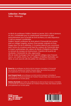Le décès du professeur Frédéric Stasiak en janvier 2022 a été et demeure un choc considérable pour la communauté universitaire et plus particulièrement pour la faculté de Droit de Nancy où cette disparition a créé un manque considérable. Frédéric Stasiak, professeur de droit pénal à l’Université de Lorraine, était un collègue singulier, porteur d’une pensée originale et d’une fougue dans l’art de la défendre. Il n’a jamais édulcoré ses convictions dans l’action et a toujours porté haut les couleurs de l’Université dans le respect systématique des valeurs de liberté, d’intégrité et d’équité. La morsure du manque est douloureuse. L’injustice de la perte est révoltante. L’immensité du vide, angoissante.