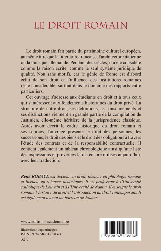 Le droit romain fait partie du patrimoine culturel européen, au même titre que la littérature française, l'architecture italienne ou la musique allemande. Pendant des siècles, il a été considéré comme la raison écrite, comme le seul système juridique de qualité. Non sans motifs, car le génie de Rome est d'abord celui de son droit et l'influence des institutions romaines reste considérable, surtout dans le domaine des rapports entre particuliers.