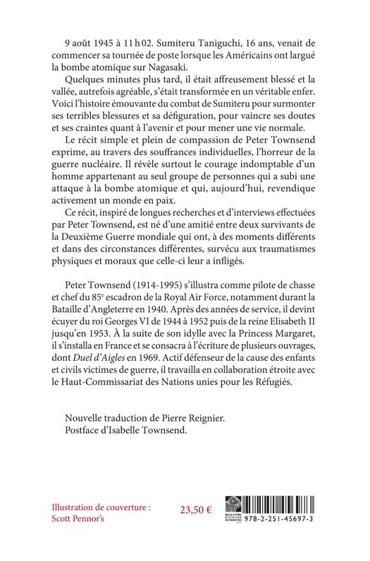9 aout 1945 a 11 h 02. Sumiteru Taniguchi, 16 ans, venait de commencer sa tournee de poste lorsque les Americains ont largue la bombe atomique sur Nagasaki. Quelques minutes plus tard, il etait affreusement blesse et la vallee, autrefois agreable, s'etait transformee en un veritable enfer. Voici l'histoire emouvante du combat de Sumiteru pour surmonter ses terribles blessures et sa defiguration, pour vaincre ses doutes et ses craintes quant a l'avenir et pour mener une vie normale. Le recit simple et plein de compassion de Peter Townsend exprime, au travers des souffrances individuelles, l'horreur de la guerre nucleaire. Il revele surtout le courage indomptable d'un homme appartenant au seul groupe de personnes qui a subi une attaque a la bombe atomique et qui, aujourd'hui, revendique activement un monde en paix. Ce recit, inspire de longues recherches et d'interviews effectuees par Peter Townsend, est ne d'une amitie entre deux survivants de la Deuxieme Guerre mondiale qui ont, a des moments differents et dans des circonstances differentes, survecu aux traumatismes physiques et moraux que celle-ci leur a infliges. Peter Townsend (1914-1995) s'illustra comme pilote de chasse et chef du 85e escadron de la Royal Air Force, notamment durant la Bataille d'Angleterre en 1940. Apres des annees de service, il devint ecuyer du roi Georges VI de 1944 a 1952 puis de la reine Elisabeth II jusqu'en 1953. A la suite de son idylle avec la Princess Margaret, il s'installa en France et se consacra a l'ecriture de plusieurs ouvrages, dont Duel d'Aigles en 1969. Actif defenseur de la cause des enfants et civils victimes de guerre, il travailla en collaboration etroite avec le Haut-Commissariat des Nations unies pour les Refugies.