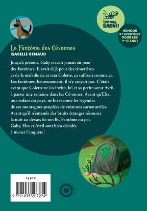 Jusqu'à présent, Gaby n'avait jamais eu peur des fantômes. Il avait déjà peur des cimetières et de la maladie de sa tata Colette, ça suffisait comme ça. Les fantômes, heureusement, il n'y croyait pas. C'était avant que Colette ne les invite, lui et sa petite soeur Avril, à passer une semaine dans les Cévennes. Avant qu'Elsa, une enfant du pays, ne lui raconte les légendes de ces montagnes peuplées de créatures surnaturelles. Avant qu'il n'entende des bruits étranges résonner la nuit au-dessus de son lit. Fantôme ou pas, Gaby, Elsa et Avril sont bien décidés à mener l'enquête !