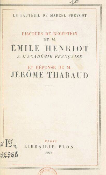 Discours de réception de M. Émile Henriot à l'Académie française et réponse de M. Jérôme Tharaud