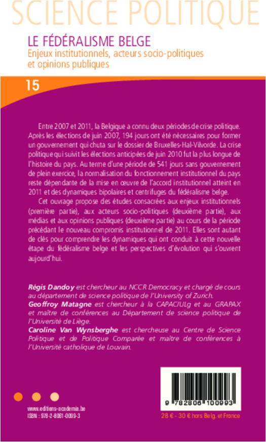 Entre 2007 et 2011, la Belgique a connu une longue période de crise politique. Cet ouvrage propose des études consacrées aux enjeux institutionnels, aux acteurs socio-politiques, aux médias et aux opinions publiques au cours de la période précédant le nouveau compromis institutionnel de 2011. Elles sont autant de clés pour comprendre les dynamiques qui ont conduit à cette nouvelle étape du fédéralisme belge et les perspectives d'évolution qui s'ouvrent aujourd'hui.