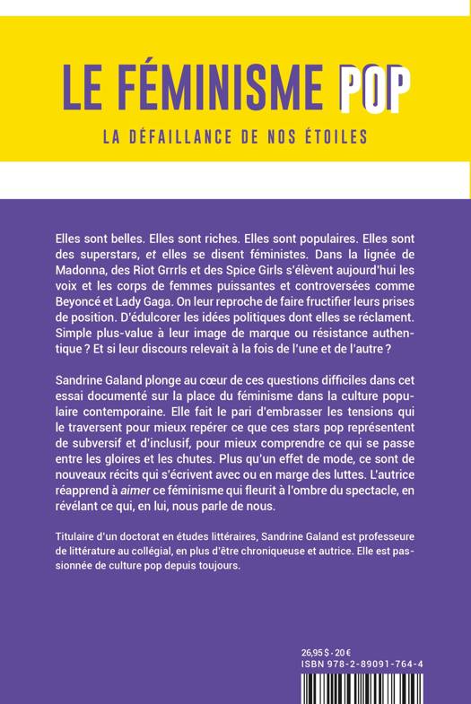 Peut-on être à la fois une pop star et une icône féministe ? Depuis qu'il est diffusé en masse sur les réseaux sociaux, et encore plus avec la libération de la parole à la suite des mouvements de dénonciation à l'échelle planétaire, le féminisme semble être devenu une forme de branding. Dans cet essai critique sur la place du féminisme dans la culture populaire contemporaine, Sandrine Galand réapprend à aimer ces figures pop pour mieux les comprendre et relever ce qu'elles représentent de subversif et d'inclusif, et révéler ce qui se passe entre la gloire et la chute de ces stars. Plus qu'un effet de mode, ce sont de nouveaux récits qui s'écrivent avec ou en marge des féminismes.