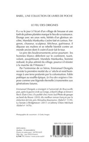 Par l'entremise de ce héros, Emmanuel Dongala revisite la première moitié du xxe siècle et rend hommage à une terre profanée par la colonisation. Fable poétique au souffle épique, «Le Feu des origines »s'impose comme une légende éternelle à transmettre aux générations futures.