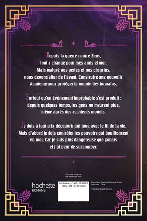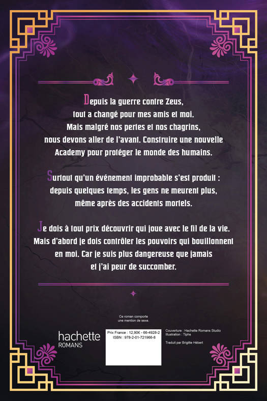 Depuis la guerre contre Zeus, tout a changé pour mes amis et moi. Mais malgré nos pertes et nos chagrins, nous devons aller de l'avant. Construire une nouvelle Academy pour protéger le monde des humains. Surtout qu'un événement improbable s'est produit : depuis quelques temps, les gens ne meurent plus, même après des accidents mortels. Je dois à tout prix découvrir qui joue avec le fil de la vie. Mais d'abord je dois contrôler les pouvoirs qui bouillonnent en moi. Car je suis plus dangereuse que jamais et j'ai peur de succomber.