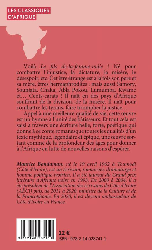Voilà Le fils de-la-femme-mâle ! Né pour combattre l'injustice, la dictature, la misère, le désespoir, etc. Cet être étrange est à la fois son père et sa mère, êtres hermaphrodites?; mais aussi Samory, Sounjata, Chaka, Abla Pokou, Lumumba, Kwame et Cents-carats ! Il naît en des pays d'Afrique souffrant de la division, de la misère. Il naît pour combattre les tyrans, faire triompher la justice Appel à une meilleure qualité de vie, cette uvre est un hymne à l'unité des bâtisseurs. Et tout cela est saisi à travers une écriture belle, forte, poétique qui donne à ce conte romanesque toutes les qualités d'un texte mythique, légendaire et épique, une uvre sortant comme de la profondeur des âges pour donner à l'Afrique en lutte de nouvelles raisons d'espérer.