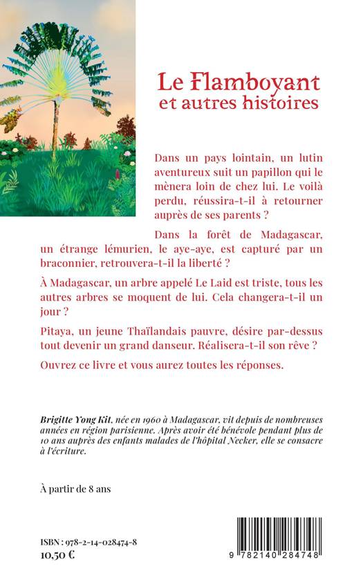 Dans un pays lointain, un lutin aventureux suit un papillon qui le mènera loin de chez lui. Le voilà perdu, réussira-t-il à retourner auprès de ses parents ? Dans la forêt de Madagascar, un étranger lémurien, le aye-aye, est capturé par un braconnier, retrouvera-t-il la liberté ? À Madagascar, un arbre appelé Le Laid est triste, tous les autres arbres se moquent de lui. Cela changera-t-il un jour ? Pitaya, un jeune Thaïlandais pauvre, désire par-dessus tout devenir un grand danseur. Réalisera-t-il son rêve ? Ouvrez ce livre et vous aurez les réponses.