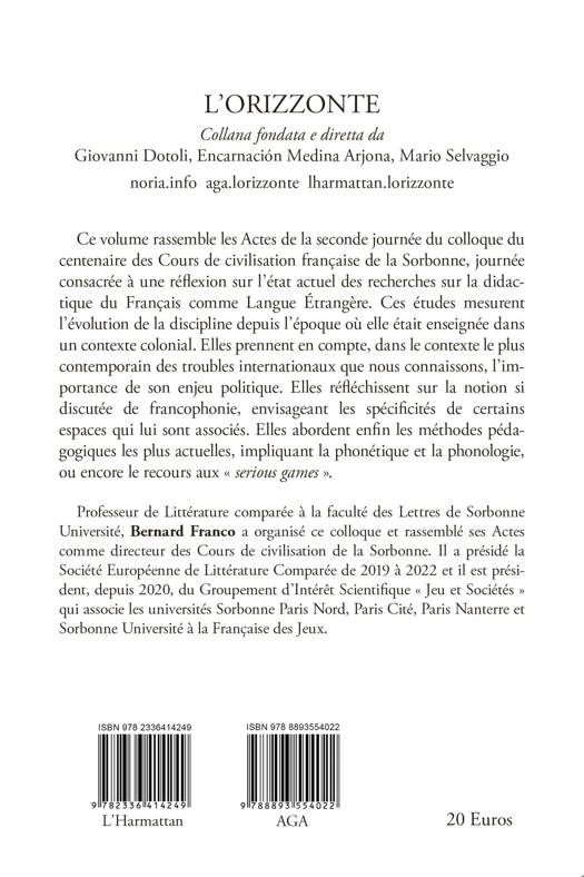 Ce volume rassemble les Actes de la seconde journée du colloque du centenaire des Cours de civilisation française de la Sorbonne, journée consacrée à une réflexion sur l’état actuel des recherches sur la didactique du Français comme Langue Étrangère. Ces études mesurent l’évolution de la discipline depuis l’époque où elle était enseignée dans un contexte colonial. Elles prennent en compte, dans le contexte le plus contemporain des troubles internationaux que nous connaissons, l’importance de son enjeu politique. Elles réfléchissent sur la notion si discutée de francophonie, envisageant les spécificités de certains espaces qui lui sont associés. Elles abordent enfin les méthodes pédagogiques les plus actuelles, impliquant la phonétique et la phonologie, ou encore le recours aux « serious games ».