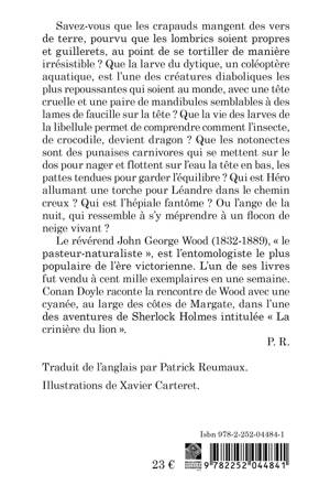 Savez-vous que les crapauds mangent des vers de terre, pourvu que les lombrics soient propres et guillerets, au point de se tortiller de maniere irresistible ? Que la larve du dytique, un coleoptere aquatique, est l'une des creatures diaboliques les plus repoussantes qui soient au monde, avec une tete cruelle et une paire de mandibules semblables a des lames de faucille sur la tete ? Que la vie des larves de la libellule permet de comprendre comment l'insecte, de crocodile, devient dragon ? Que les notonectes sont des punaises carnivores qui se mettent sur le dos pour nager et flottent sur l'eau la tete en bas, les pattes tendues pour garder l'equilibre ? Qui est Hero allumant une torche pour Leandre dans le chemin creux ? Qui est l'hepiale fantome ? Ou l'ange de la nuit, qui ressemble a s'y meprendre a un flocon de neige vivant ?
