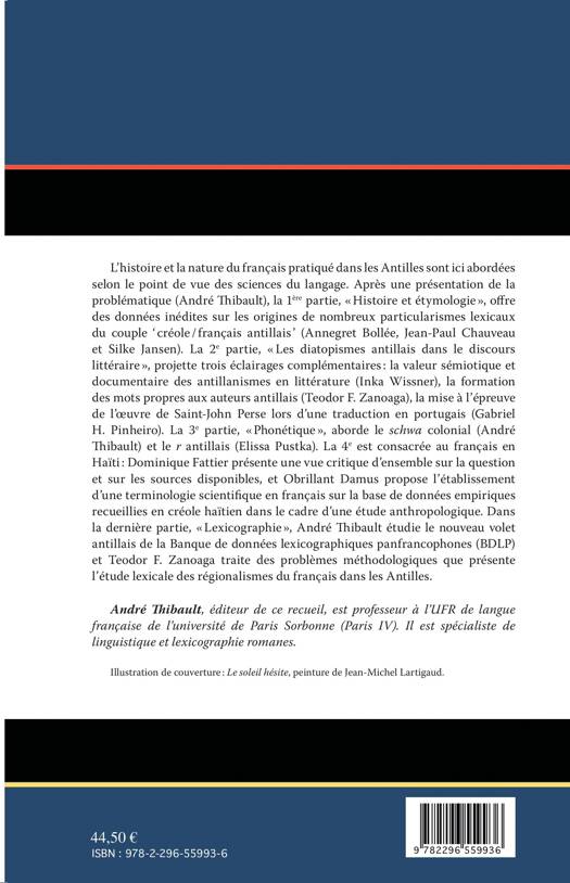 L'histoire et la nature du français pratiqué dans les Antilles sont ici abordées selon le point de vue des sciences du langage. La première partie offre des données inédites sur les origines de nombreux particularismes lexicaux du couple 'créole / français antillais'. La deuxième partie projette trois éclairages complémentaires : la valeur sémiotique et documentaire des antillanismes en littérature, la formation des mots propres aux auteurs antillais, la mise à l'épreuve de l'oeuvre de Saint-John Perse lors d'une traduction en portugais. La troisième partie aborde le schwa colonial et le r antillais. La dernière partie est conscrée au français en Haïti.