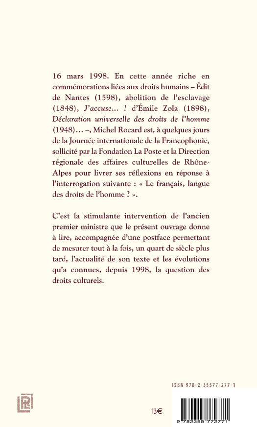 Les langues naissent et demeurent libres et égales en droits – y compris en droit d’exprimer les droits de l’homme<br /><br /> Cet ouvrage est une réédition d’un essai paru en 1998. En cette année riche en commémorations liées aux droits humains – Édit de Nantes (1598), abolition de l’esclavage (1848), J’accuse... ! d’Émile Zola (1898), Déclaration universelle des droits de l’homme (1948)... –, Michel Rocard est, à quelques jours de la Journée internationale de la Francophonie, sollicité par la Fondation La Poste et la Direction régionale des affaires culturelles de Rhône-Alpes pour livrer ses réflexions en réponse à l’interrogation suivante : « Le français, langue des droits de l’homme ? ».<br /> Pour Michel Rocard, c’est sans conteste en français qu’a été précocement formulé ce qu’il est convenu d’appeler désormais les « droits humains ». Mais, tout autant que leur affirmation, la négation de ces droits s’exprime aussi dans notre langue. Par conséquent, aux yeux de l’auteur, l'avenir du français dépend surtout du dynamisme de notre langue dans le mouvement du monde et de sa capacité à prendre en compte les évolutions de la société contemporaine. <br /><br /> C’est la stimulante intervention de l’ancien premier ministre que le présent ouvrage donne à lire, accompagnée d’une postface permettant de mesurer tout à la fois, un quart de siècle plus tard, l’actualité de son texte et les évolutions qu’a connues, depuis 1998, la question des droits culturels.<br />