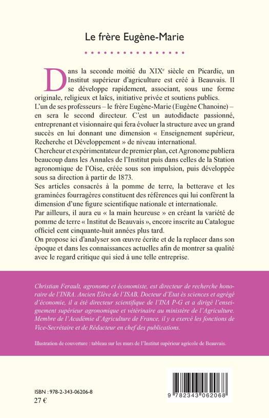 Dans la seconde moitié du XIXe siècle, un Institut supérieur d'agriculture est créé à Beauvais. L'un de ses professeurs - le frère Eugène-Marie (Eugène Chanoine) - en sera le second directeur. Autodidacte passionné, entreprenant et visionnaire, il fera évoluer la structure en lui donnant une dimension de niveau international. Chercheur et expérimentateur de premier plan, il publiera beaucoup, dans les annales de l'Institut notamment. Cet ouvrage analyse son oeuvre écrite et la replace dans son époque et dans les connaissances actuelles afin de montrer sa qualité.