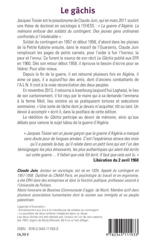Jacques Tissier est le pseudonyme de Claude Juin. Réédition d'un texte publié en 1960, ce récit puise sa source dans les carnets que l'auteur a remplis en tant qu'appelé pendant la guerre d'Algérie en 1957 et 1958. Il y écrivait avec précisions les dates, les lieux, faits, événements, embuscades, patrouilles, arrestations des suspects et disparitions. Le titre symbolise le gâchis d'une jeunesse entraînée dans une guerre coloniale. La réédition du Gâchis participe du devoir de mémoire, ainsi qu'aux débats pour vaincre le sujet tabou de la guerre d'Algérie.