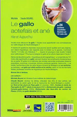 Dans une deuxième partie - linguistique et ethnographique - un ensemble de 101 mots-clés significatifs du gallo viennent illustrer les constituants fondamentaux de ce parler. ET, grâce à la méthode des entrées secondes pratiquées (blasons populaires, coutumes, croyances, dictons, pratiques agraires, toponymie...) se révèle l’authentique état de cette langue qui se rechome, se redresse, "ce gallo qui refait surface et le mérite" selon le mot de Henriette Walter, professeur émérite de linguistique de Haute-Bretagne.