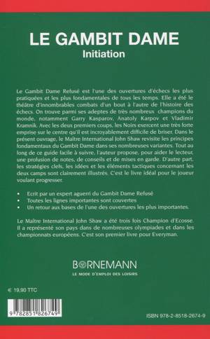 Dans le présent ouvrage, le Maître international John Shaw revisite les principes fondamentaux du Gambit Dame dans ses nombreuses variantes. Tout au long de ce guide facile à suivre, l'auteur propose, pour aide le lecteur, une profusion de notes, de conseils et de mise en garde. D'autre part, les stratégies clefs, les idées et les éléments tactiques concernant les deux camps sont clairement illustrés. C'est le livre idéal pour le joueur voulant progresser.