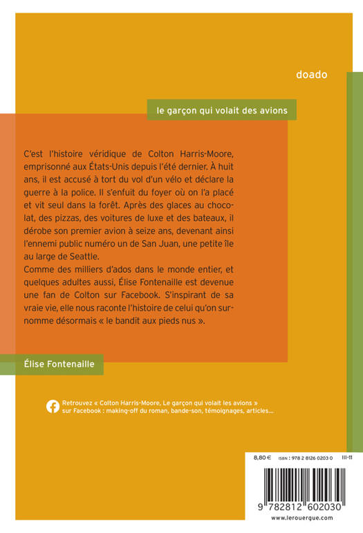 La véritable histoire de Colton Harris-Moore, un ado américain de 16 ans, arrêté en juillet 2010 après avoir volé des dizaines de voitures, de bateaux? et même d?avions. Pendant deux ans, il a vécu en homme libre et sauvage sur un archipel d?îles, au large de Seattle. Il est devenu un héros de légende pour la jeunesse américaine (une page facebook lui est dédiée).
