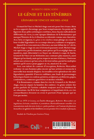Leonard de Vinci et Michel-Ange sont nes pour etre rivaux. Rien ne les a opposes davantage que leurs temperaments. Au point qu'ils figurent deux poles artistiques extremes, deux facons radicalement differentes de vivre, a cette epoque fabuleuse de la Renaissance qui marqua l'histoire de la civilisation occidentale comme une charniere. Avec brio et rigueur, Le genie et les tenebres nous plonge au coeur de leur rivalite legendaire en ces temps obscurs, exaltants et tragiques. Quand ils se rencontrent, a Florence, au tout debut du XVIe siecle, Michel-Ange a vingt-six ans et Leonard quarante-neuf. Michel-Ange est capricieux, perfectionniste, aussi pieux qu'il est neglige dans ses manieres, mais determine a se frayer un chemin a coups de burin. Leonard de Vinci est un hedoniste aux contours plus nuances, aussi elegant qu'un dandy, mais qui ne respecte aucune echeance, s'interesse autant aux sciences qu'aux arts, et devient meme, parmi les multiples metiers qu'il exerce pour gagner sa vie, musicien de cour. Avec son talent de conteur d'exception, Roberto Mercadini redonne vie aux hommes plus encore qu'aux artistes et ressuscite a merveille leur monde disparu: les troubles et les splendeurs de cites legendaires, quantite d'oeuvres sublimes, une foule de personnages historiques hauts en couleur, peintres, sculpteurs, architectes, papes, condottieres, comtesses guerrieres et moines rebelles. A la Renaissance, comme dans les vies de Leonard et de Michel-Ange, rien ne separe la lumiere des ombres: le genie solaire des gestes parfaits de l'artiste cohabite toujours avec les tenebres de ses obsessions. Au fil de leur somptueux et inquietant recit, ces vies extraordinaires dressent en creux le portrait d'une epoque qui ne l'est pas moins.