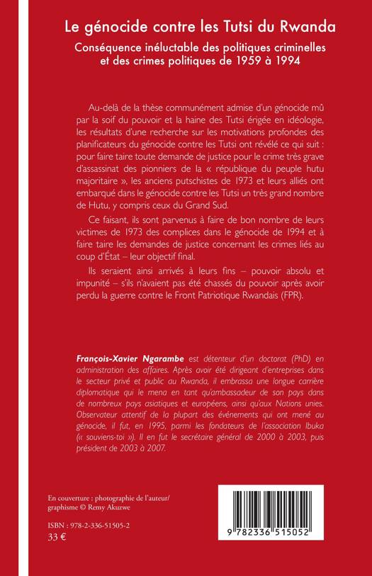 Au-delà de la thèse communément admise d'un génocide mû par la soif du pouvoir et la haine des Tutsi érigée en idéologie, les résultats d'une recherche sur les motivations profondes des planificateurs du génocide contre les Tutsi ont révélé ce qui suit: pour faire taire toute demande de justice pour le crime très grave d'assassinat des pionniers de la république du peuple hutu majoritaire, les anciens putschistes de 1973 et leurs alliés ont embarqué dans le génocide contre les Tutsi un très grand nombre de Hutu, y compris ceux du Grand Sud. Ce faisant, ils sont parvenus à faire de bon nombre de leurs victimes de 1973 des complices dans le génocide de 1994 et à faire taire les demandes de justice concernant les crimes liés au coup d'État - leur objectif final. Ils seraient ainsi arrivés à leurs fins - pouvoir absolu et impunité - s'ils n'avaient pas été chassés du pouvoir après avoir perdu la guerre contre le Front Patriotique Rwandais (FPR).