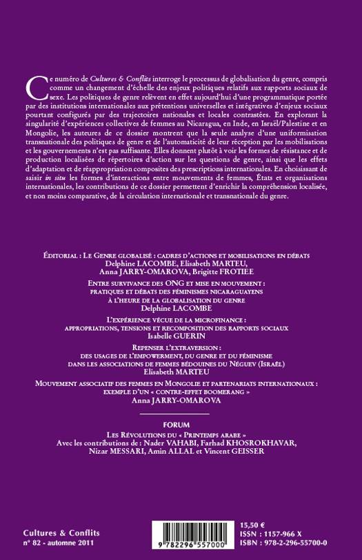 Ce numéro interroge le processus de globalisation du genre, compris comme un changement d'échelle des enjeux politiques relatifs aux rapports sociaux de sexe. En explorant la singularité d'expériences collectives de femmes au Nicaragua, en Inde, en Israël/Palestine et en Mogolie, ces contributions montrent que la seule analyse d'une uniformisation transnationale des politiques de genre et de l'automaticité de leur réception par les mobilisations et les gouvernements n'est pas suffisante.