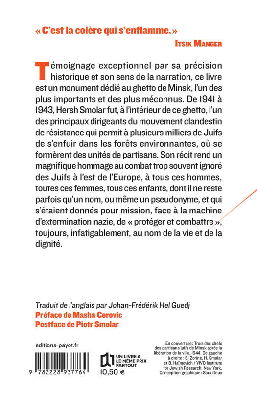 Témoignage exceptionnel par sa précision historique et son sens de la narration, ce livre est un monument dédié au ghetto de Minsk, l'un des plus grands et des plus méconnus. De 1941 à 1943, Hersh Smolar fut, à l'intérieur de ce ghetto, l'un des principaux dirigeants du mouvement clandestin de résistance qui permit à plusieurs milliers de Juifs de s'enfuir dans les forêts environnantes, où se formèrent des unités de partisans. Son récit rend un magnifique hommage au combat trop souvent ignoré des Juifs à l'est de l'Europe, à tous ces hommes, toutes ces femmes, tous ces enfants, dont il ne reste parfois qu'un nom, ou même un pseudonyme, et qui s'étaient donnés pour mission, face à la machine d'extermination nazie, de « protéger et combattre », toujours, infatigablement, au nom de la vie et de la dignité.