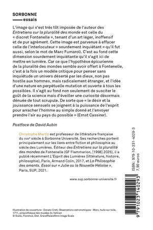 Christophe Martin propose ici une lecture moderne de cette œuvre intemporelle, révélant la finesse littéraire et l’audace intellectuelle de Fontenelle. Ce livre redonne vie à un auteur parfois réduit à des jugements anciens, et montre comment ses écrits continuent d’éveiller la curiosité scientifique, au-delà des cercles spécialisés.