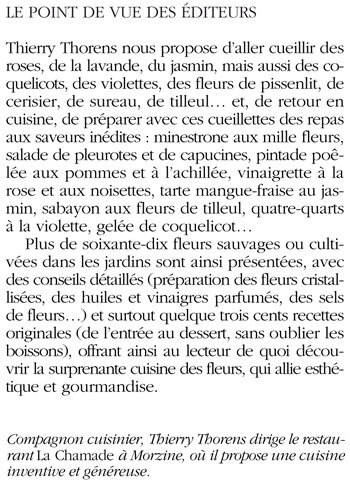 Thierry Thorens nous propose d'aller cueillir des roses, de la lavande, du jasmin, mais aussi des coquelicots, des violettes, des fleurs de pissenlit, de cerisier, de sureau, de tilleul... et, de retour en cuisine, de préparer avec ces cueillettes des repas aux saveurs inédites : minestrone aux mille fleurs, salade de pleurotes et de capucines, pintade poêlée aux pommes et à l'achillée, vinaigrette à la rose et aux noisettes, tarte mangue-fraise au jasmin, sabayon aux fleurs de tilleul, quatre-quarts à la violette, gelée de coquelicot... Plus de soixante-dix fleurs sauvages ou cultivées dans les jardins sont ainsi présentées, avec des conseils détaillés (préparation des fleurs cristallisées, des huiles et vinaigres parfumés, des sels de fleurs...) et surtout quelque trois cents recettes originales (de l'entrée au dessert, sans oublier les boissons), offrant ainsi au lecteur de quoi découvrir la surprenante cuisine des fleurs, qui allie esthétique et gourmandise. « Compagnon cuisinier, Thierry Thorens dirige le restaurant La Chamade à Morzine, où il propose une cuisine inventive et généreuse.»