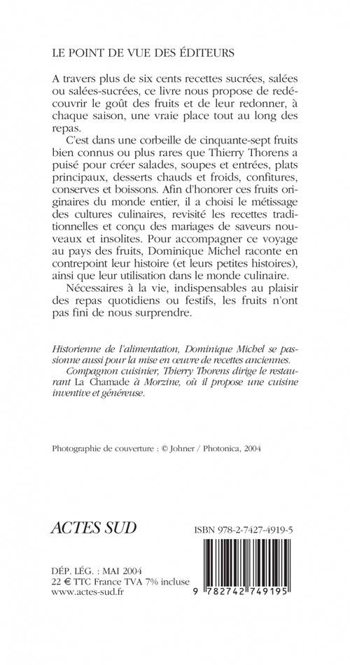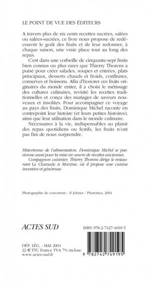 A travers plus de six cents recettes sucrées salées ou salées-sucrées, ce livre nous propose de redécouvrir le goût des fruits et de leur redonner, à chaque saison, une vraie place tout au long des repas. C'est dans une corbeille de cinquante-sept fruits bien connus ou plus rares que Thierry Thorens a puisé pour créer salades, soupes et entrées, plats principaux, desserts chauds et froids, confitures, conserves et boissons. Afin d'honorer ces fruits originaires du monde entier, il a choisi le métissage des cultures culinaires, revisité les recettes traditionnelles et conçu des mariages de saveurs nouveaux et insolites. Pour accompagner ce voyage au pays des fruits, Dominique Michel raconte en contrepoint leur histoire (ou leurs petites histoires), ainsi que leur utilisation dans le monde culinaire. Nécessaires à la vie, indispensables au plaisir des repas quotidiens ou festifs, les fruits n'ont pas fini de nous surprendre.