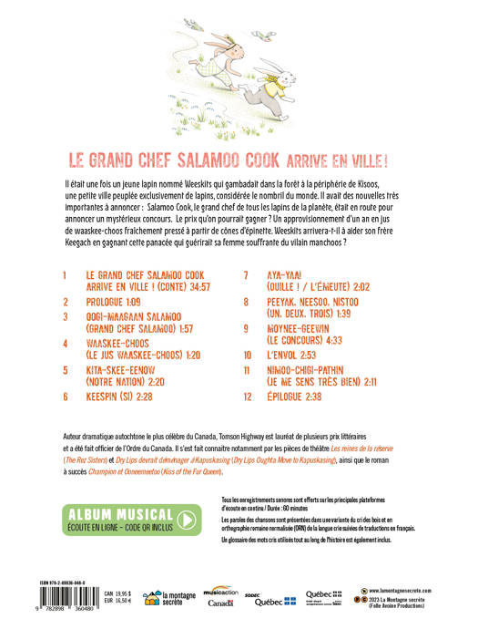 Le grand chef Salamoo Cook arrive en ville ! is a laugh-out-loud riot of a tale in French, interspersed with eight jazzy songs performed in Cree. The book includes a glossary of words in Cree and the accompanying recordings can be accessed with a QR code printed in the book.