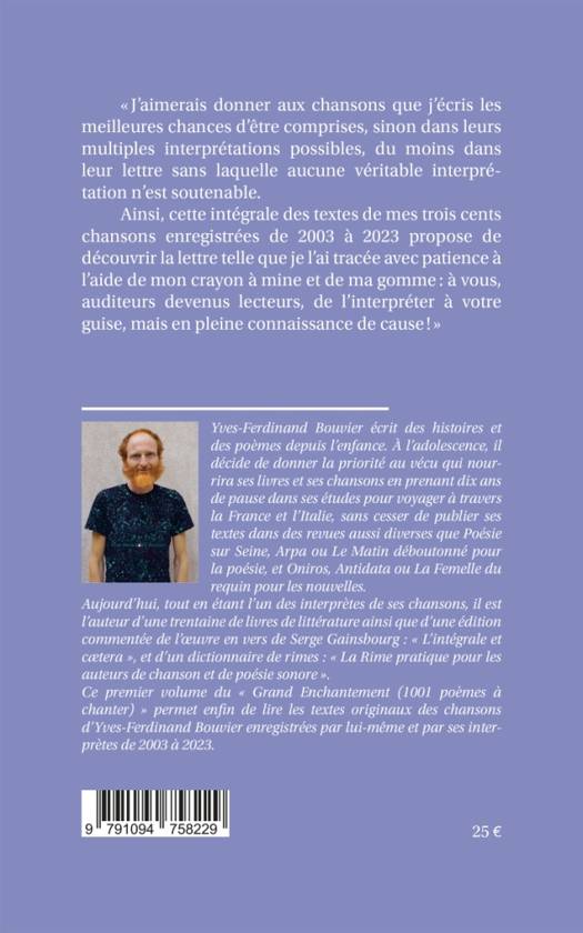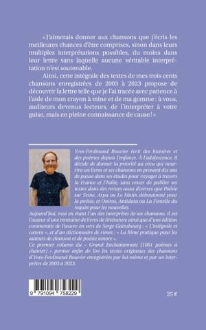 Ce premier volume du «Grand Enchantement (1001 poèmes à chanter)» permet enfin de lire les textes originaux des trois cents chansons d’Yves-Ferdinand Bouvier enregistrées par lui-même et par ses interprètes de 2003 à 2023: «J’aimerais donner aux chansons que j’écris les meilleures chances d’être comprises, sinon dans leurs multiples interprétations possibles, du moins dans leur lettre sans laquelle aucune véritable interprétation n’est soutenable. Ainsi, cette intégrale de leurs textes propose de découvrir la lettre telle que je l’ai tracée avec patience à l’aide de mon crayon à mine et de ma gomme : à vous, auditeurs devenus lecteurs, de l’interpréter à votre guise, mais en pleine connaissance de cause!»