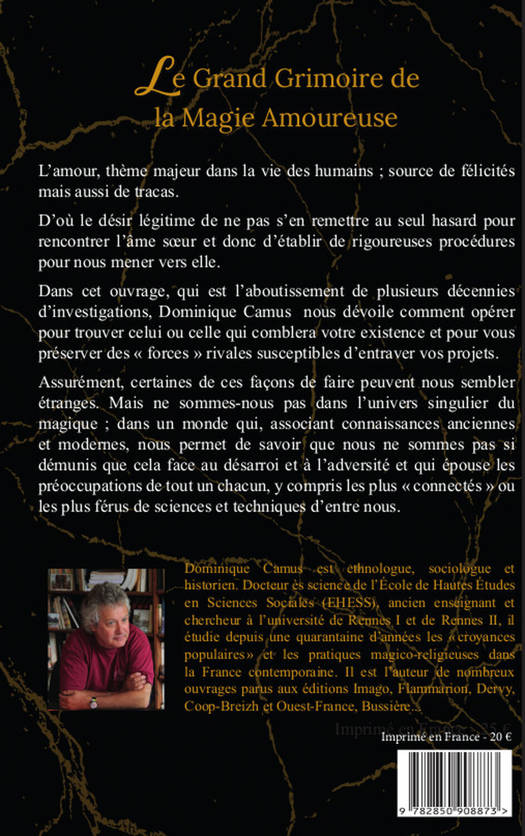 Aujourd'hui comme hier, la première chose qu'un être souhaite, c'est de réussir sa vie amoureuse. N'est-ce pas dans l'amour que l'on puise ses plus grandes sources de bonheur et d'accomplissement ? Dans cet ouvrage de Dominique Camus, le grand spécialiste et sociologue de la magie, vous fait découvrir les rituels de magie amoureuse les plus puissants, ceux que les sorciers de nos campagnes utilisent depuis des centaines d'années, et dont l'efficacité admirable peut conduire à déclencher une rencontre sentimentale comme à faire naître et croître les feux de l'amour chez la personne aimée. Tous les secrets révélés dans ces pages ont été transmises à l'auteur par ceux qui les mettent en œuvre. Plus qu'un travail sociologique, c'est un véritable grimoire que nous livre aujourd'hui Dominique Camus.