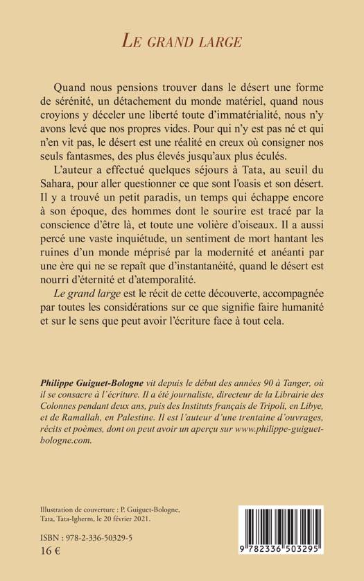 Quand nous pensions trouver dans le désert une forme de sérénité, un détachement du monde matériel, quand nous croyions y déceler une liberté toute d’immatérialité, nous n’y avons levé que nos propres vides. Pour qui n’y est pas né et qui n’en vit pas, le désert est une réalité en creux où consigner nos seuls fantasmes, des plus élevés jusqu’aux plus éculés. L’auteur a effectué quelques séjours à Tata, au seuil du Sahara, pour aller questionner ce que sont l’oasis et son désert. Il y a trouvé un petit paradis, un temps qui échappe encore à son époque, des hommes dont le sourire est tracé par la conscience d’être là, et toute une volière d’oiseaux. Il a aussi percé une vaste inquiétude, un sentiment de mort hantant les ruines d’un monde méprisé par la modernité et anéanti par une ère qui ne se repaît que d’instantanéité, quand le désert est nourri d’éternité et d’atemporalité. Le grand large est le récit de cette découverte, accompagnée par toutes les considérations sur ce que signifie faire humanité et sur le sens que peut avoir l’écriture face à tout cela.