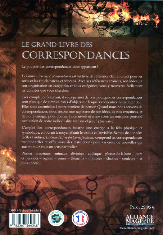 Le pouvoir des correspondances vous appartient ! Le Grand Livre des Correspondances est un livre de référence clair et direct pour les sorts et les rituels païens et wiccans. Avec ses références croisées, son index, et son organisation en catégories et sous-catégories, vous y trouverez facilement les données que vous cherchez. Très complet et fascinant, il vous permet de voir pourquoi les correspondances sont plus que de simples listes d'objets sur lesquels concentrer notre intention. Elles sont essentielles à notre manière de penser. Quand nous nous servons de correspondances, nous tissons une tapisserie de nos idées, de nos croyances, et de notre énergie, pour donner à nos rituels et à nos sorts un sens plus profond par l'union de notre individualité avec un objectif plus vaste. L'emploi des correspondances incarne une énergie à la fois physique et symbolique, et fournit le moyen d'unir le visible et l'invisible. Rempli de données faciles à utiliser, le Grand Livre des Correspondances comprend les correspondances traditionnelles et offre aussi des instructions pour en créer de nouvelles qui auront pour vous un sens particulier. Plantes - minéraux - animaux - divinités - zodiaque - phases de la lune - jours et périodes - ogham - runes - éléments - nombres - chakras - couleurs - et plus encore...