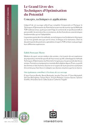 Les Techniques d’Optimisation du Potentiel (TOP) apportent des outils simples et opérationnels dont l’efficacité a été prouvée dans plusieurs domaines dont la gestion du stress, la gestion de la fatigue, l’apprentissage… Cette méthode TOP a fait ses preuves depuis une trentaine d’année dans de nombreux secteurs : performances sportives, santé, entreprises de tous horizons, police nationale, pompiers, enseignement, etc. Une méthode qui permet de s’adapter à toutes les situations en gérant efficacement sa dépense d’énergie dans la durée. Ce Grand Livre offre au lecteur une introduction complète à la méthode TOP, complétée par des exemples pratiques d'application à de nombreux domaines.
