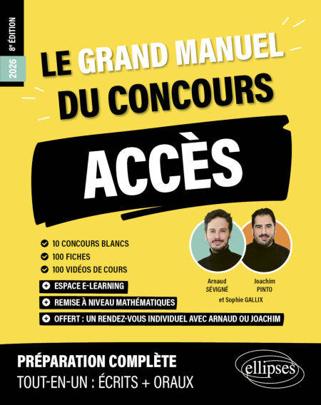 Livre OFFICIEL de la prépa de référence Hello Prépa (www.hello-prepa.com), cet ouvrage de référence écrit par Joachim PINTO (HEC Paris) et Arnaud SÉVIGNÉ (HEC Paris) vous propose une préparation complète au concours ACCES (écrits + oraux).