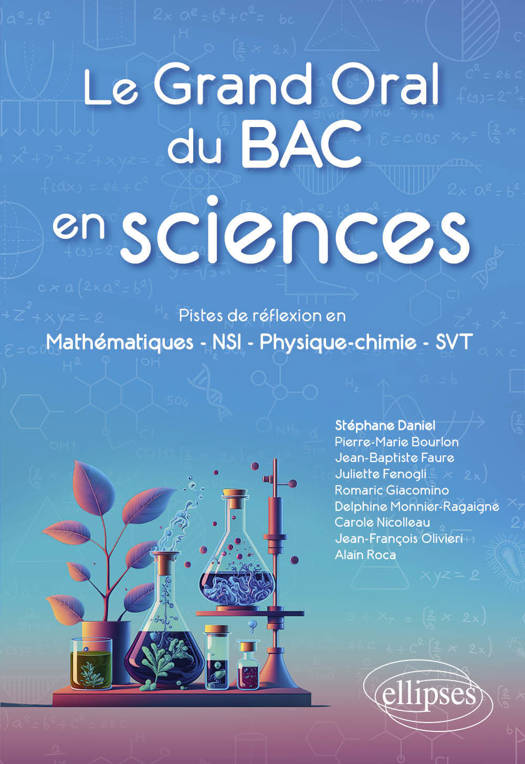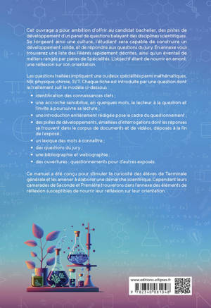 Cet ouvrage a pour ambition d’offrir au candidat bachelier, des pistes de développement d’un panel de questions balayant des disciplines scientifiques. Se forgeant ainsi une culture, l’étudiant sera capable de construire un développement solide, et de répondre aux questions du jury. En annexe vous trouverez une liste des filières rapidement décrites, ainsi qu’un éventail de métiers rangés par paires de Spécialités. L’objectif étant de nourrir en amont, une réflexion sur son orientation.