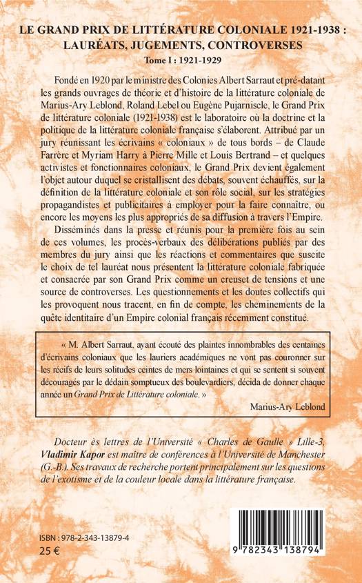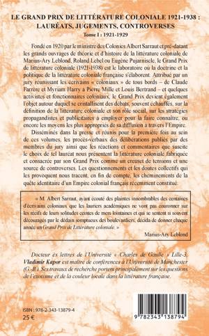 Fondé en 1920, le Grand Prix de la littérature coloniale (1921-1938) est le laboratoire où la doctrine et la politique de la littérature coloniale française s'élaborent. Autour de ce Grand Prix se cristallisent des débats sur la définition de la littérature coloniale, son rôle social, sur les stratégies propagandistes à employer pour sa diffusion à travers l'Empire. Voilà réunis pour la première fois les procès-verbaux des délibérations et les commentaires que suscite le choix de tel lauréat.