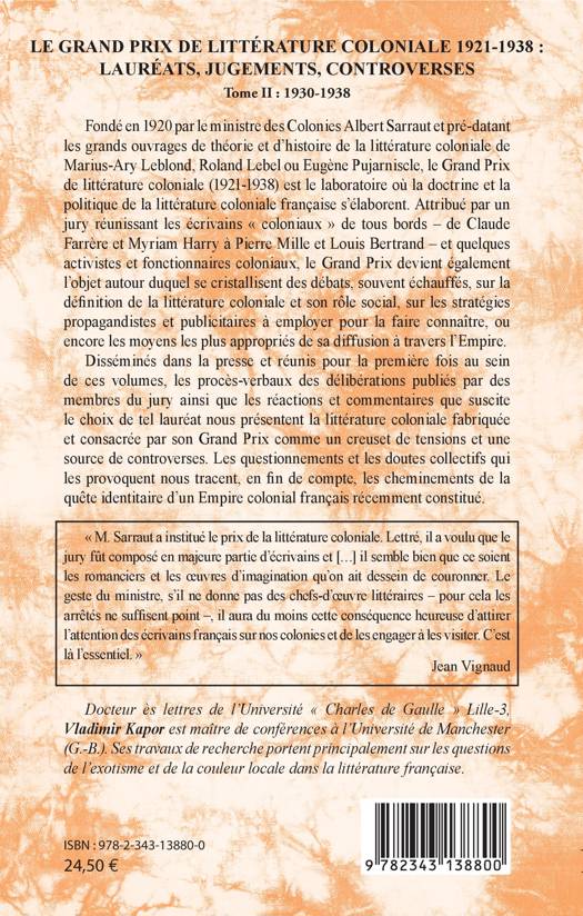 Fondé en 1920, le Grand Prix de la littérature coloniale (1921-1938) est le laboratoire où la doctrine et la politique de la littérature coloniale française s'élaborent. Autour de ce Grand Prix se cristallisent des débats sur la définition de la littérature coloniale, son rôle social, sur les stratégies propagandistes à employer pour sa diffusion à travers l'Empire. Voilà réunis pour la première fois les procès-verbaux des délibérations et les commentaires que suscite le choix de tel lauréat.